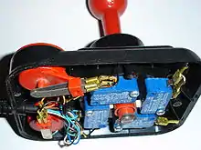 The Wico Command Control was one of the earliest examples of a stick that differed radically from the Atari pattern in mechanical terms. Wico was a major supplier of arcade game joysticks and adapted these mechanisms for home use.[12] These replaced the membrane switches with leaf switches that were much more robust and provided the recentering force internally. A large rounded-corner square block of plastic provided the moving surface similar to the hemisphere in the CX40, but was shaped to provide more obvious directions when pressed, sliding along the edges of the square. The stick, a steel tube covered in a bat-like red plastic moulding, featured a button on top that pressed a shaft running through the center of the stick to another switch below the main assembly.[30]