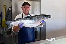 Atlantic salmon are the largest species in their genus, Salmo. After two years at sea, the fish average 71 to 76 cm (28 to 30 in) in length and 3.6 to 5.4 kg (7.9 to 11.9 lb) in weight.[5] But specimens that spend four or more winters feeding at sea can be much larger. An Atlantic salmon netted in 1960 in Scotland, in the estuary of the river Hope, weighed 49.44 kg (109.0 lb), the heaviest recorded in all available literature. Another netted in 1925 in Norway measured 160.65 cm (63.25 in) in length, the longest Atlantic salmon on record.[6]