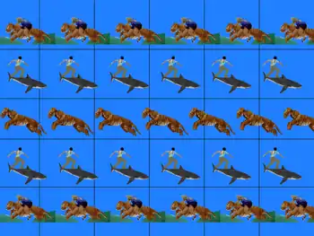 Smooth gradients can also be achieved with an intelligible pattern, assuming that the pattern is complex enough and does not have big, horizontal, monotonic patches. A big area painted with monotonic color without change in hue and brightness does not lend itself to pixel shifting, as the result of the horizontal shift is identical to the original patch. The following depth map of a shark with smooth gradient produces a perfectly readable autostereogram, even though the 2D image contains small monotonic areas; the brain is able to recognize these small gaps and fill in the blanks (illusory contours). While intelligible, repeated patterns are used instead of random dots, this type of autostereogram is still known by many as a Random Dot Autostereogram, because it is created using the same process.