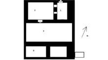 The building complex known as The Temple of Oboda sits on the acropolis of the city.[5] The temple was built as a dedication to the deified Nabataean king Obodas I. The temple stands adjacent to the east of two other buildings: a Christian chapel and a second temple known as the “western temple.” The temple dedicated to the cult of Obodas the King was built with a hard-limestone in the year 9 BCE during the reign of Obodas II. The temple is a tripartite structure: consisting of a porch, hall and adytum; its overall dimensions are 14 by 11 metres (46 ft × 36 ft). The building was divided into four rooms. The first and second rooms were unequal subdivisions of the adytum (debir), the first room is the eastern room which is the smaller of the two measuring at 3 by 4 metres (9.8 ft × 13.1 ft). The second room was the western room and the larger of the two rooms measuring 5 by 4 metres (16 ft × 13 ft). The third room was the hall (hekhal), an oblong shape measuring 8 metres (26 ft), which is now completely covered by a Talus. The fourth room is the porch (‘ulam) divided into two compartments one facing west measuring approximately 4 by 4 metres (13 ft × 13 ft) and the other facing east measuring approximately 4 by 4.5 metres (13 ft × 15 ft) were divided by a 60-centimetre (2 ft) wall.[6] A worshiper entered through the porch, which faces south, proceeded through the hall to the rooms of the adytum at the northern end. The worshiper then turned about face toward south to worship the images of the deities placed in niches in the wall. The western room contained two niches which may have contained the images of two Nabataean gods Allat and Dushura. The other room contained a larger single niche where it is believed the defied image of Obodas the King was worshiped. The temple was built to be his eternal resting place and the center of worship for his cult.[7]