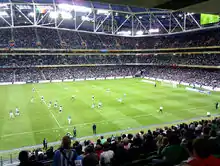 The stadium also hosts the home games of the Republic of Ireland national football team, as did Lansdowne Road. The team had played most home games at Croke Park during the construction of the Aviva Stadium. The first football match in the Aviva Stadium was Manchester United against a League of Ireland XI side, managed by Damien Richardson, on 4 August 2010.[302] Manchester United won the game 7–1, with Park Ji-Sung scoring the first ever goal in the Aviva Stadium.[303] The first international game for Ireland in the Aviva Stadium was a 1–0 friendly loss against Argentina on 11 August 2010.[304] The first competitive goal was scored by Kevin Kilbane in a Euro 2012 qualifying game on 7 September 2010 against Andorra.[305]