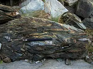 The Bündner schists can be found throughout the Penninic zone of the Alps, often forming zones of high strain between or large infolded synclines (so called Mulde or Mulden) in the crystalline nappes that are made of more competent gneiss.[1]