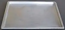 A sheet pan, also referred to as baking tray, baking sheet, or baking pan, is a flat, rectangular metal pan placed in an oven and used for baking pastries such as bread rolls, cookies, sheet cakes, Swiss rolls, and pizzas.