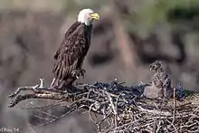 Most non-human-related mortality involves nestlings or eggs. Around 50% of eagles survive their first year.[165] However, in the Chesapeake Bay area, 100% of 39 radio-tagged nestlings survived to their first year.[175] Nestling or egg fatalities may be due to nest collapses, starvation, sibling aggression or inclement weather. Another significant cause of egg and nestling mortality is predation. Nest predators include large gulls, corvids (including ravens, crows and magpies), wolverines (Gulo gulo), fishers (Pekania pennanti), red-tailed hawks, owls, other eagles, bobcats, American black bears (Ursus americanus) and raccoons.[162][176][177][178][107][179][180][181] If food access is low, parental attendance at the nest may be lower because both parents may have to forage, thus resulting in less protection.[28] Nestlings are usually exempt from predation by terrestrial carnivores that are poor tree-climbers, but Arctic foxes (Vulpes lagopus) occasionally snatched nestlings from ground nests on Amchitka Island in Alaska before they were extirpated from the island.[69] The bald eagle will defend its nest fiercely from all comers and has even repelled attacks from bears, having been recorded knocking a black bear out of a tree when the latter tried to climb a tree holding nestlings.[182]