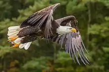 The bald eagle is a powerful flier, and soars on thermal convection currents. It reaches speeds of 56–70 km/h (35–43 mph) when gliding and flapping, and about 48 km/h (30 mph) while carrying fish.[53] Its dive speed is between 120–160 km/h (75–99 mph), though it seldom dives vertically.[54] Regarding their flying abilities, despite being morphologically less well adapted to faster flight than golden eagles (especially during dives), the bald eagle is considered surprisingly maneuverable in flight. Bald eagles have also been recorded catching up to and then swooping under geese in flight, turning over and thrusting their talons into the other bird's breast.[29] It is partially migratory, depending on location. If its territory has access to open water, it remains there year-round, but if the body of water freezes during the winter, making it impossible to obtain food, it migrates to the south or to the coast. A number of populations are subject to post-breeding dispersal, mainly in juveniles; Florida eagles, for example, will disperse northwards in the summer.[55] The bald eagle selects migration routes which take advantage of thermals, updrafts, and food resources. During migration, it may ascend in a thermal and then glide down, or may ascend in updrafts created by the wind against a cliff or other terrain. Migration generally takes place during the daytime, usually between the local hours of 8:00 a.m. and 6:00 p.m., when thermals are produced by the sun.[14]