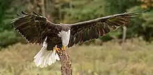 The bald eagle is an opportunistic carnivore with the capacity to consume a great variety of prey. Fish often comprise most of the eagle's diet throughout their range.[56] In 20 food habit studies across the species' range, fish comprised 56% of the diet of nesting eagles, birds 28%, mammals 14% and other prey 2%.[57] More than 400 species are known to be included in the bald eagle's prey spectrum, far more than its ecological equivalent in the Old World, the white-tailed eagle, is known to take. Despite its considerably lower population, the bald eagle may come in second amongst all North American accipitrids, slightly behind only the red-tailed hawk, in number of prey species recorded.[29][57][58][59]