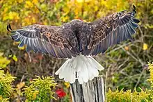 The largest eagles are from Alaska, where large females may weigh more than 7 kg (15 lb) and span 2.44 m (8 ft 0 in) across the wings.[15][27] A survey of adult weights in Alaska showed that females there weighed on average 5.35 kg (11.8 lb), respectively, and males weighed 4.23 kg (9.3 lb) against immatures which averaged 5.09 kg (11.2 lb) and 4.05 kg (8.9 lb) in the two sexes.[28][29] An Alaskan adult female eagle that was considered outsized weighed some 7.4 kg (16 lb).[30] R.S. Palmer listed a record from 1876 in Wyoming County, New York of an enormous adult bald eagle that was shot and reportedly scaled 8.2 kg (18 lb).[29] Among standard linear measurements, the wing chord is 51.5–69 cm (20.3–27.2 in), the tail is 23–37 cm (9.1–14.6 in) long, and the tarsus is 8 to 11 cm (3.1 to 4.3 in).[16][31] The culmen reportedly ranges from 3 to 7.5 cm (1.2 to 3.0 in), while the measurement from the gape to the tip of the bill is 7–9 cm (2.8–3.5 in).[31][32] The bill size is unusually variable: Alaskan eagles can have up to twice the bill length of birds from the southern United States (Georgia, Louisiana, Florida), with means including both sexes of 6.83 cm (2.69 in) and 4.12 cm (1.62 in) in culmen length, respectively, from these two areas.[33][34]