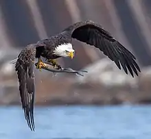 In the Pacific Northwest, spawning trout and salmon provide most of the bald eagles' diet from late summer throughout fall.[74] Though bald eagles occasionally catch live salmon, they usually scavenge spawned salmon carcass.[75][76] Southeast Alaskan eagles largely prey on pink salmon (Oncorhynchus gorbuscha), coho salmon (O. kisutch) and, more locally, sockeye salmon (O. nerka), with Chinook salmon (O. tshawytscha).[72] Due to the Chinook salmon's large size (12 to 18 kg (26 to 40 lb) average adult size) probably being taken only as carrion and a single carcass can attract several eagles.[72] Also important in the estuaries and shallow coastlines of southern Alaska are Pacific herring (Clupea pallasii), Pacific sand lance (Ammodytes hexapterus) and eulachon (Thaleichthys pacificus).[72] In Oregon's Columbia River Estuary, the most significant prey species were largescale suckers (Catostomus macrocheilus) (17.3% of the prey selected there), American shad (Alosa sapidissima; 13%) and common carp (Cyprinus carpio; 10.8%).[73] Eagles living in the Chesapeake Bay in Maryland were found to subsist largely on American gizzard shad (Dorosoma cepedianum), threadfin shad (Dorosoma petenense) and white bass (Morone chrysops).[77] Floridian eagles have been reported to prey on catfish, most prevalently the brown bullhead (Ameiurus nebulosus) and any species in the genus Ictalurus as well as mullet, trout, needlefish, and eels.[18][45][78] Chain pickerels (Esox niger) and white suckers (Catostomus commersonii) are frequently taken in interior Maine.[79] Wintering eagles on the Platte River in Nebraska preyed mainly on American gizzard shads and common carp.[80] Bald eagles are also known to eat the following fish species: rainbow trout (Oncorhynchus mykiss), white catfish (Ameiurus catus), rock greenling (Hexagrammos lagocephalus), Pacific cod (Gadus macrocephalus), Atka mackerel (Pleurogrammus monopterygius), largemouth bass (Micropterus salmoides), northern pike (Esox lucius), striped bass (Morone saxatilis), dogfish shark (Squalidae.sp) and Blue walleye (Sander vitreus).[81][82][83]