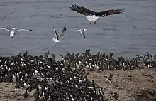 Due to easy accessibility and lack of formidable nest defense against eagles by such species, bald eagles are capable of preying on such seabirds at all ages, from eggs to mature adults, and they can effectively cull large portions of a colony.[95] Along some portions of the North Pacific coastline, bald eagles which had historically preyed mainly kelp-dwelling fish and supplementally sea otter (Enhydra lutris) pups are now preying mainly on seabird colonies since both the fish (possibly due to overfishing) and otters (cause unknown) have had steep population declines, causing concern for seabird conservation.[96] Because of this more extensive predation, some biologist has expressed concern that murres are heading for a "conservation collision" due to heavy eagle predation.[95] Eagles have been confirmed to attack nocturnally active, burrow-nesting seabird species such as storm petrels and shearwaters by digging out their burrows and feeding on all animals they find inside.[97] If a bald eagle flies close by, waterbirds will often fly away en masse, though they may seemingly ignore a perched eagle in other cases. when the birds fly away from a colony, this exposes their unprotected eggs and nestlings to scavengers such as gulls.[95]