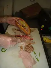 Until the 1950s, sandwiches hewed closely to French tastes, typically a jambon-beurre moistened with a mayonnaise or liver pâté spread.[18][19][15][2] The 1954 Partition of Vietnam sent over a million migrants from North Vietnam to South Vietnam, transforming Saigon's local cuisine.[16] Among the migrants were Lê Minh Ngọc and Nguyễn Thị Tịnh, who opened a small bakery named Hòa Mã in District 3. In 1958, Hòa Mã became one of the first shops to sell bánh mì thịt.[18][20][21] Around this time, another migrant from the North began selling chả sandwiches from a basket on a mobylette,[22] and a stand in Gia Định Province (present-day Phú Nhuận District) began selling phá lấu sandwiches.[23] Some shops stuffed sandwiches with inexpensive Cheddar cheese, which came from French food aid that migrants from the North had rejected.[15] Vietnamese communities in France also began selling bánh mì.[17]
