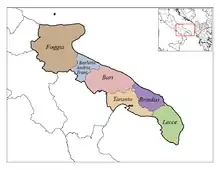 Bombino bianco is a permitted grape variety in several DOC zones including the Biferno DOC in the province of Campobasso and Pentro di Isernia DOC in the Isernia province of Molise, Bianco Capena, Cerveteri, Cesanese di Olevano Romano, Frascati, and Marino DOCs in the province of Rome in Lazio, the Genazzano DOC that includes both the Rome and Frosinone provinces of Lazio, the Colli Romagna Centrale and Pagadebit di Romagna DOC that are produced in both the Forlì-Cesena and Ravenna provinces of Emilia-Romagna, the Gravina DOC from the Bari province in Apulia, Leverano DOC from the province of Lecce, Martina Franca and Locorotondo DOCs that extends into both the Bari and Brindisi provinces, and the Cacc'e mmitte di Lucera and San Severo DOC in the Foggia province of Apulia.[7][6]