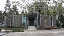 The administration building was officially opened on 2 December 1963.[28] It was built to house the majority of council's staff and departments, and was a two-storey square block with an external colonnade and basement level for parking.[29] The rates, health & building, and Town Clerk's departments were located on the ground floor, while the upper floor contained the engineering and planning departments. The building's main lobby featured a mosaic mural by Michael Santry depicting the history of Bankstown, in addition to marble-clad columns, timber panelling, and terrazzo floors.[29] In 1964, the exterior lighting of the Civic Centre received an award for meritorious lighting from the Australian Illuminating Engineering Society.[28] In 1966 a new fountain, the "Dane Fountain", was unveiled outside the building to commemorate the service of H. W. Dane as administrator of the council.[28]