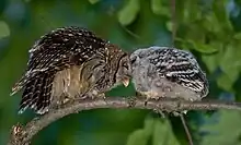 The female tends to closely brood the young for three weeks. Then after, she begins to hunt for the young. Both parents normally continue hunt for the young until they are about 6 weeks old and can fly well.[26] During the first three weeks, the male does all prey deliveries, either bringing prey directly into the nest or leaves for the female at the nest entrance or on a nearby branch. The mean number of prey deliveries when the young are 6–10 days old is 2.4 per night, 1.4 when they are 11–15 days old, 3.6 when they are 16–20 days old and 2.2 when they are 21–25 days old. He will continue hunting until the young disperse.[7][127][217] The female's prey deliveries are much more frequent when she resumes hunting, ranging from a mean of 4.8 to 8 deliveries nightly.[7][127] Male prey deliveries are often sporadically at any point through the night while female deliveries tend to be clustered immediately after sunset or just before sunrise.[127] Barred owls have a variable reaction to human disturbance. Some parent owls remain sitting, while some leave the nest upon a person's approach and some attack people climbing to the nest, as well as those approaching young on or near the ground.[42][54][225] There are several accounts of barred owls engaging in fierce nest defense against humans, sometimes reportedly knocking people out of trees.[9][42][225] However, their aggression is variable and, based on studies of similar owls like tawny and Ural owls from Europe, attacks tend to only occur when intrusions and disturbance by humans are frequent. A distraction display was recorded by a female barred owl when humans approached. In it, she spread and quivered her wings and engaged in chittering and squealing, somewhat similar to the sounds made by begging young.[226]