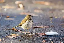 In more enclosed wooded areas, radio-tagging and video-monitoring of various passerines nests as well as examinations of owl pellets has shed light on the relationship of barred owls with these potential prey resources. Not only was the barred owl found to be a surprisingly routine predator at woodland passerine nests, but that an unexpected bulk of the acts of predation in studies from Missouri and Illinois were carried out during the daytime. Many different forest bird species (most frequently acadian flycatchers and indigo buntings in Missouri and Illinois) were hunted. These studies indicated that the barred owl may snatch passerines of any age, but recent fledglings are taken preferentially due to their more conspicuous behavior and limited ability to fly away. In Minnesota, about 62% of studied hermit thrush and ovenbird fledglings were taken per one study, with all thrush that nested in the 50 m (160 ft) radius of the barred owl's nests failing to produce any young. A similarly high rate of local determent by barred owls has been found for other woodland thrushes like the veery, wood thrush and varied thrush, with the additional finding that pre-dawn singing by certain thrushes, when their escape abilities are dulled by the dim light, leaves them vulnerable to barred owl ambushes.[100][165][166][167] Forest birds seem to recognize the barred owl as a threat, with mobbing behavior evoked easily by playing recordings of their calls in the daytime.