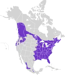 The barred owl is distributed throughout most of the eastern United States, as well as much of southern Canada.[4] They are found as far northeast as much of Nova Scotia (western two-thirds), New Brunswick and Sept-Îles, in much of Quebec, up to Lake Mistassini, and Ontario, up to Moosonee.[1][57][58][59][60] The barred owl has been recorded as ended up as far north as central Labrador, though the species is not yet confirmed to breed in the province.[61] The barred owl ranges in every part of the eastern United States continuously from northernmost Maine down throughout New England, the Mid-Atlantic states, much of the Midwest, the Southeast United States and all of Florida.[1][23] They are found to as far west without substantial gaps to the limits of western Minnesota, easternmost South Dakota, the southeastern corner of Nebraska, the eastern half roughly of Kansas, most of Oklahoma and east Texas to as far west as Cisco and Burnet.[1][62][63][64][65] Arguably and discontinuously from Texas, the species may range into central and southern Mexico but these populations are now often considered a separate species.[1][66] These initial parts of the range in the eastern and central stretches would be considered as where the species is "native".[7][67] A wandering barred owl was once seen flying over Lake Michigan 48 km (30 mi) from the nearest land.[68]