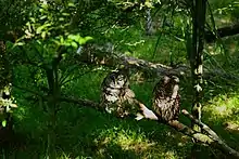One predator that is a major source of conflict for the barred owl is the great horned owl.[7] In every part of their range, barred owls are compelled to share space with the larger owls.[9] There is habitat partitioning between the barred owl and great horned owl that allows them to often co-exist. Great horned owls prefer various more open habitats mixed with trees, often in rather upland areas, which differs from the habitats preferred by the barred owl.[9][65] If a great horned owl moves into an area, barred owls appear to avoid said areas, based on radio telemetry data.[85] In much of the east, habitat alteration and fragmentation tends to favor the great horned owl at the expense of the barred owl. Where more continuous forest is available, however, the great horned and barred owl can occur surprisingly close to one another. In one case, a barred owl was observed to roost only 400 m (1,300 ft) from a great horned owl.[85][193] In general the reforestation at the northern sections of the Great Plains have, on the contrary, benefited barred owls (and may have been a part of allowing their westward expansion) and been perhaps slightly detrimental to the great horned owl.[69] However, even where the habitat becomes less ideal, the great horned owl is unlikely to vacate an area, unlike the barred owl which can be entirely displaced if woods become too small and fragmented.[7][70] Great horned owls and barred owls have similar diets, as both are wide-ranging, large and opportunistic owls.[23][65] However, the great horned owl is larger in bulk, sometimes averaging nearly twice as heavy, with much heavier, larger feet and talons.[9][133] The great horned owl has a more powerful grip strength[128] and access to a wider variety of prey than barred owls, which take fewer prey species because they occur in more limited habitats and have a smaller overall distribution.[9][42][136][194][40] A study utilizing stable isotopes in Alberta appeared to confirm that the great horned owl preys on nearly twice as many prey species as do the barred owls of the area.[195]