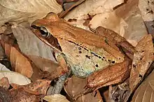 Amphibians are taken almost entirely during the breeding season, as they become unavailable to barred owls during the winter months.[123][137] Most reported amphibian prey in Oregon were unidentified "medium-sized salamanders". A diversity of frog sizes may be taken, varying potentially in size from spring peepers, which average around 4 g (0.14 oz), to American bullfrogs, which average around in mature bullfrogs 430 g (15 oz).[183][184] A notable act of successful predation was carried out by a barred owl on a rough-skinned newt, which contains toxins that are often deadly to predators. Apparently, the owl was able to survive after consuming the newt.[185] The rarest variety of vertebrate prey for barred owls is fish.[116] However, there are several accrued accounts of fishing by these owls, including older accounts of barred owls coming to ice holes made by human fishermen and more recent accounts of possibly routine fishing by the owls on the St. Johns River in Florida, in the latter case utilizing a fishing dock as a hunting perch.[42][186] At least five species of fish have been identified in the foods of barred owls, including fairly large fish like brown bullheads and largemouth bass.[9][42][137]
