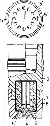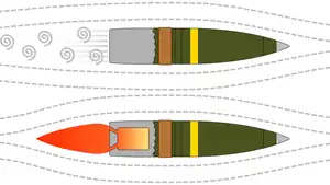 Base bleed or base burn (BB)[1] is a system used on some artillery shells to increase range, typically by about 20–35%. It expels gas into the low pressure area behind the shell to reduce base drag (it does not produce thrust; if it did it would be a rocket-assisted projectile). Since it extends the range by a percentage, it is more useful on longer range artillery where an increase of approximately 5–15 kilometres (3.1–9.3 mi) can be achieved, and it also was found that the reduced turbulence gave the projectiles a more consistent trajectory, resulting in tighter grouping and efficient shelling more than 40 km away.