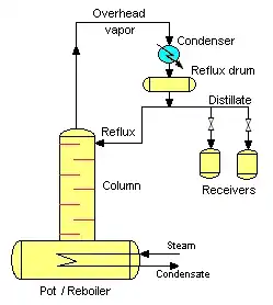 The simplest and most frequently used batch distillation configuration is the batch rectifier, including the alembic and pot still. The batch rectifier consists of a pot (or reboiler), rectifying column, a condenser, some means of splitting off a portion of the condensed vapour (distillate) as reflux, and one or more receivers.