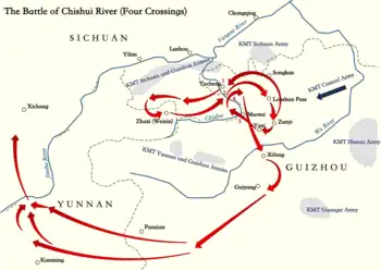 The Battle of Chishui River (simplified Chinese: 赤水战役; traditional Chinese: 赤水戰役), popularly known in mainland China as the Four Crossings of the Chishui River or "Crossing the Chishui River Four Times" (四渡赤水), was a major battle between the Chinese Communist Party (CCP) and the Chinese Nationalist Party (KMT) in 1935. It was the first major battle commanded by Mao Zedong during the Long March, and it is regarded as one of the most representative battles under Mao's command. This battle was a turning point in the first phase of Chinese Civil War. The Chinese Red Army jumped out of the encirclement of Kuomintang by unexpectedly crossing the Chishui River four times, and eventually survived the anti-communist military campaign of Chiang Kai-shek.
