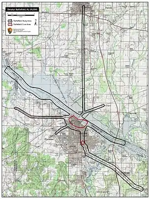 When Hood arrived at Decatur on October 26, he found a Federal infantry force of 3,000 to 5,000 men defending an entrenched line that included two forts and 1,600 yards of rifle pits; a much heavier force than Roddey had believed. Two Federal gunboats patrolled the river.[7] General George Thomas, in Nashville, sent supplies and reinforcements to Decatur along with orders to "defend Decatur to the last extremity."[8] On October 27, Hood arranged his army as it arrived to encircle Decatur.[7] Meanwhile, the Union continued to pour reinforcements into Decatur which arrived just in time to fill gaps in the wavering Union lines.[8] The next morning, he sent Confederate skirmishers through a dense fog to a ravine within 800 yards of the main fortifications. At about noon, a Federal regiment drove the skirmishers out of the ravine, capturing 125 men. "With the soldiers hungry and supplies scarce", Hood knew he could not afford the casualties from a full-scale assault and decided to cross the Tennessee River elsewhere. He marched further the west and crossed near Tuscumbia, Alabama, where Muscle Shoals prevented interference by the Federal gunboats.[7]
