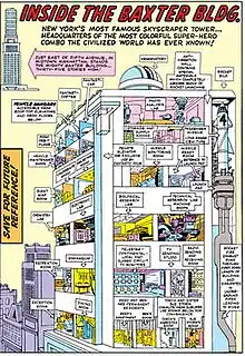 The Baxter Building is a fictional 35-story office building appearing in American comic books published by Marvel Comics. Created by Stan Lee and Jack Kirby, the building first appeared in Fantastic Four #3 (March 1962). The construction is depicted in Manhattan, and its five upper floors house the Fantastic Four's headquarters.[1][2][3][4]
