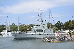 The Bay-class Minehunter Inshores were a class of catamaran-hull mine warfare vessels operating with the Royal Australian Navy from 1986. Also referred to as the MHCAT (MineHunter CATamaran), the class was an attempt to produce a locally designed inshore mine warfare vessel.[1] Two prototype ships were ordered in 1981, with the first ship, Rushcutter, commissioned in November 1986.[1] The two ships experienced delays in construction, and the RAN resorted to acquiring six minesweeper auxiliaries (MSA) under the Craft of Opportunity Program to provide an interim mine-warfare capability, while also keeping Ton-class minesweeper HMAS Curlew in service until 1990, well beyond her intended decommissioning date.[1][2] The ships did not enter service until 1993, due to problems with the sonar.[3]