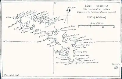 Beckmann Fjord, Bellingshausen Point, Brunonia Glacier, Cape Wilson, Grace Glacier, Lucas Glacier, Sea Leopard Fjord, and Sunset Fjord were charted in 1912-13 by Robert Cushman Murphy, who visited South Georgia in the brig Daisy.[23] Beckmann Fjord was named for Captain Beckmann, master gunner of the whaler Don Ernesto, who lost his life in a whaling accident in December 1912.[25] Bellingshausen Point was named for Admiral Thaddeus Bellingshausen.[24] Murphy named Brunonia Glacier for his alma mater, Brown University, using a Latinized version of the name.[15] Cape Wilson was named for American President Woodrow Wilson.[29] Grace Glacier was named for Murphy's wife, Grace Barstow Murphy.[20] He named Lucas Glacier for Frederic Augustus Lucas, then-director of the American Museum of Natural History.[21] Sunset Fjord was named because he could see the sunset directly behind the fjord from his anchorage in the Bay of Isles.[13]