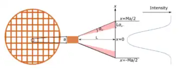 A schematic of mask based reconstruction. A charged particle beam is blocked by a grid and the profile is analyzed at a screen to the right.