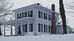 The Benjamin Van Raalte House is a two-story, rectangular Italian Villa house with clapboard siding sitting atop a hill. It has a low hipped roof with projecting eaves and a frieze underneath, encircling the house. Marrow pilasters are at the corners of the house. The front elevation contains an entrance on the left-hand side, with two windows on the right. On the second floor are three evenly spaced windows. Each window is a two-over-two double-hung style, with segmental-arch heads. A single-story hip-roof veranda extends across the front and wraps to one side. A single-story kitchen addition extends from one side at the rear.[2]
