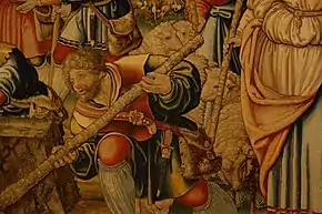 From the 1520s on, under the influence of the Raphael tapestries woven at Brussels for Pope Leo X, van Orley's tapestries began to increasingly resemble paintings, more in line with the aesthetics of the Renaissance,[12] as can be seen in his Passion series - one set in the Royal Palace of Madrid and the other set dispersed over several museums - and the Lamentation in the National Gallery of Art, Washington, D.C. These tapestries, some woven by Pieter de Pannemaeker, clearly show the influence of the tapestry cartoons of Raphael and the work of Dürer in the rendering of the figure types. Since Dürer had been a guest in the house of van Orley at the time the contracts for these tapestries were signed, it is possible that the two artists may have discussed the design. For the first time in "Passion" tapestries, the figures received dramatic weight through their large size and their position in the foreground.[13]