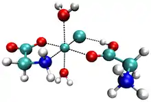 Structure of the salt induced peptide formation complex with one chelating and one end-on coordinated glycine ligand, one chloride ligand and two axial water molecules obtained via energy minimization at Hartree-Fock level in implicit solvent.[10]