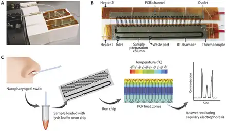 38. Wanunu, Meni; Cao, Qingqing; Mahalanabis, Madhumita; Chang, Jessie; Carey, Brendan; Hsieh, Christopher; Stanley, Ahjegannie; Odell, Christine A.; Mitchell, Patricia; Feldman, James; Pollock, Nira R.; Klapperich, Catherine M. (2012). "Microfluidic Chip for Molecular Amplification of Influenza A RNA in Human Respiratory Specimens". PLOS ONE. 7 (3): e33176. Bibcode:2012PLoSO...733176C. doi:10.1371/journal.pone.0033176. ISSN 1932-6203. PMC 3310856. PMID 22457740.