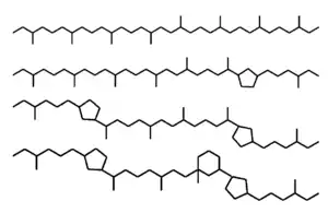 Biphytane can be found in cyclic forms containing one to three pentacyclic rings when derived from isoprenoid GDGTs with such biosynthetically cyclized isoprenoid carbon skeletons.[5] In most analyzed samples from the environment, the acyclic form with biphytane as the isoprenoid carbon chain is typically the most abundant form.[2] Hence, in this article, biphytane is used to refer to the acyclic form unless stated otherwise.