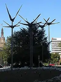 Birds of Knowledge of Good and Evil is a public artwork by Polish sculptor Magdalena Abakanowicz. It is located on the Kilbourn Avenue boulevard in Milwaukee, Wisconsin, United States. The 2001 aluminum sculpture consists six pieces organized in columns. The column heights are 4–6 meters, and the dimensions of the birds are: height 100–160 cm, width 190–260 cm, length 120–135 cm.