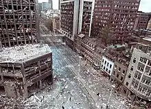 The Bishopsgate bombing occurred on 24 April 1993, when the Provisional Irish Republican Army (IRA) detonated a powerful truck bomb on Bishopsgate, a major thoroughfare in London's financial district, the City of London. Telephoned warnings were sent about an hour beforehand, but a news photographer was killed in the blast and 44 people were injured, with fatalities minimised due to it occurring on a Saturday. The blast destroyed the nearby St Ethelburga's church and wrecked Liverpool Street station and the NatWest Tower.[2][3]