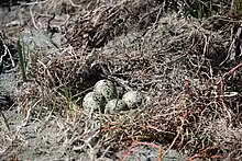 Black stilts breed at 2 (more usually 3) years of age. They nest as solitary pairs, not in a protective colony like pied stilts.[4] Both birds collaborate on building a nest in July or August on stable islands or banks in a shingle riverbed; pairs tend to nest in the same site each year.[2] Three to five eggs are laid from September to December, peaking in October, and are incubated for roughly 25 days. Chicks take six to eight weeks to fledge,[3] and remain with their parents for a further six to eight months.[2]