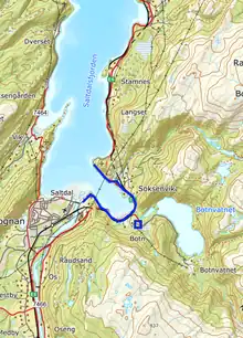 The Blood Road was a road section northeast of Rognan in the municipality of Saltdal. The road was a new section of Norwegian National Road 50 between Rognan and Langset on the east side of Saltdal Fjord, where there was a ferry connection before the war.[9]: 46 The Blood Road itself now corresponds to a section of today's European route E6 between Saltnes and Saksenvik.[4]: 24 The prisoners that built the road belonged to the Botn camp.