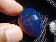 Blue amber is a rare variety of amber resin that exhibits a blue coloration. Blue amber has been most commonly found in the Dominican Republic—especially in the amber mines around the city of Santiago and, less commonly, in the eastern half of the country. In the modern age, it was discovered at about the same time as Dominican amber.[1][2][3]