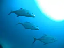 The bluefin trevally is a schooling species as a juvenile, transitioning to a more solitary fish with well defined home ranges as an adult.[25] Adults do school to form spawning aggregations or temporarily while hunting, with evidence from laboratory studies indicates bluefin trevally are able to coordinate these aggregations over coral reefs based on the release of dimethylsulfoniopropionate (DMSP) from the reef. DMSP is a naturally occurring chemical produced by marine algae and to a lesser extent corals and their symbiotic zooxanthellae.[26] The number of fish present in an area is also influenced by tidal factors and possibly the abundance of prey and other environmental factors.[25] Tracking studies in Hawaii have found bluefin trevally patrol back and forth along a home range of patch reef walls during the day, only stopping for variable periods where major depth changes or discontinuities in the reef were present. Several fish patrol the same reef patch, reversing direction where the others do. While most fish patrol the one reef, some have been observed to make excursions to nearby reefs, before returning to their home reef later.[27] Night time movements are less extensive than daytime movements, with the trevally moving rapidly between several small reef sections, before slowing down and milling in one patch for around an hour. The fish living in a particular region congregate in one area at night, before returning to their individual daytime range during the day. The reason for this congregation is unclear, but may be important to the social structure of the species.[27] Long-term studies have found the fish may range up to 10.2 km over several months, however, is much less restricted in its movements than its relative, the giant trevally.[28] A Hawaiian biomass study found the species to be one of the most abundant large predators in the islands, however it is less abundant in the heavily exploited Main Hawaiian Islands compared to the remote Northwest Hawaiian Islands. The main difference in these populations was the relative lack of large adult fish in the inhabited areas compared to the remote, unfished regions.[29] A study on carangids caught during a fishing tournament in Hawaii found the bluefin trevally is the most common trevally species taken, accounting for over 80% of the carangid catch. The authors note that this may not only reflect its abundance, but also it vulnerability to specific fishing methods used in the tournament.[22] Apart from the typical predator-prey relationship the species shows (described later), an individual of the species has been seen to rub itself against the skin of a Galapagos shark, apparently to rid itself of parasites. This behaviour is also observed in rainbow runner and is a rare example of a commensal cleaner relationship where the cleaner does not gain anything.[30]