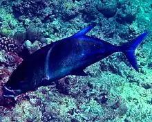 The bluefin trevally (Caranx melampygus), also known as the bluefin jack, bluefin kingfish, bluefinned crevalle, blue ulua, omilu, and spotted trevally, is a species of large, widely distributed marine fish classified in the jack family, Carangidae. The bluefin trevally is distributed throughout the tropical waters of the Indian and Pacific Oceans, ranging from Eastern Africa in the west to Central America in the east, including Japan in the north and Australia in the south. The species grows to a maximum known length of 117 centimetres (46 in) and a weight of 43.5 kilograms (96 lb), however is rare above 80 centimetres (31 in). Bluefin trevally are easily recognised by their electric blue fins, tapered snout and numerous blue and black spots on their sides. Juveniles lack these obvious colours, and must be identified by more detailed anatomical features such as fin ray and scute counts. The bluefin trevally inhabits both inshore environments such as bays, lagoons and shallow reefs, as well as deeper offshore reefs, atolls and bomboras. Juveniles prefer shallower, protected waters, even entering estuaries for short periods in some locations.