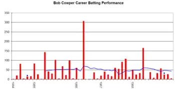 He was dropped in the 1965–66 Ashes series for slow scoring. When he was recalled for the Fifth Test at Melbourne he made the first Test triple-century in Australia: 307 from 589 balls in 727 minutes.[4] Matthew Hayden's 380 against Zimbabwe in 2002–03 is now the highest Test century in Australia, but Cowper's remains the longest.
