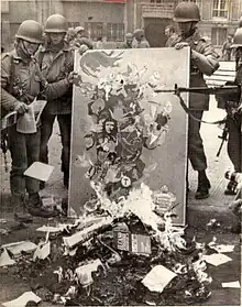 During the years of the Chilean military dictatorship under Augusto Pinochet from 1973 to 1990, hundreds of books were burned as a way of repression and censorship of left-wing literature.[64][65] In some instances, even books on Cubism were burned because soldiers thought it had to do with the Cuban Revolution.[66][67]