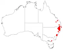 This bossiaea grows in open forest and woodland from Kroombit Tops National Park in south east Queensland and south along the coast and tablelands of eastern New South Wales to Fitzroy Falls.[2][3]