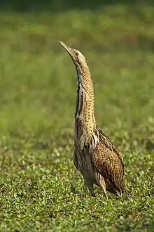 The four Botaurus bitterns are all large chunky, heavily streaked brown birds which breed in large reed beds. Almost uniquely for predatory birds, the female rears the young alone.[3] They are secretive and well-camouflaged, and despite their size they can be difficult to observe except for occasional flight views.
