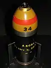 The bourrelet is identified by the white line around the circumference of this mortar projectile. No rotating band is required for use in an unrifled mortar.