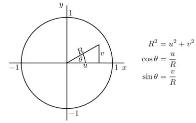 Two uniformly distributed values, u and v are used to produce the value s = R2, which is likewise uniformly distributed. The definitions of the sine and cosine are then applied to the basic form of the Box–Muller transform to avoid using trigonometric functions.
