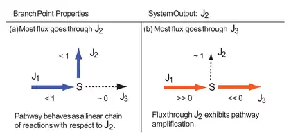 Changes in flux control depending on whether the flux goes through the upper or lower branches. The system output is J2. If most of the flux goes through J2(a) then the pathway behaves like a simple linear change, where flux control on J3 is negligible and control is shared between J1 and J2. The other extreme is when most of the flux goes through J3 (b). This makes J2 highly sensitive to changes in J1 and J3 resulting is very high flux control, often greater than 1.0. Under these conditions the flux control at J3 is also negative since J3 can siphon off flux from J2.