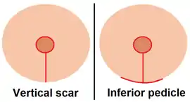 The inferior pedicle (central mound) features a blood vessel supply (arterial and venous) for the NAC from an inferior, centrally-based attachment to the chest wall.[22] The skin pedicle maintains the innervation and vascular viability of the NAC, which produces a reduced, sensitive breast with full lactational capability and function.[23] The volume and size reduction of hypertrophied breasts is performed with a periareolar incision to the NAC, which then extends downwards, following the natural curve of the breast hemisphere. After cutting and removing the requisite quantities of tissue (glandular, adipose, skin), the NAC is transposed higher upon the breast hemisphere; thereby, the inferior pedicle technique produces an elevated bust with breasts that are proportionate to the patients's person. Breast-reduction with an inferior pedicle occasionally produces breasts that appear squared; despite this, the technique effectively reduces the very enlarged breasts of macromastia and gigantomastia.