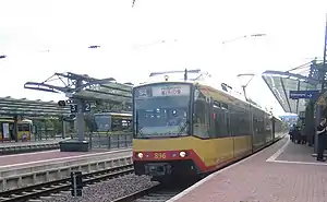 The Western Railway through Bretten station was electrified in the 1950s. When Karlsruhe Stadtbahn services opened on the Kraichgau Railway to Bretten-Gölshausen on 25 September 1992, along with the electrification of the Kraichgau Railway, this first two-system light railway (tram-train) line was called line B. In May 1994, Stadtbahn line S9 opened from Bruchsal to Bretten and it was extended to Mühlacker in 1999. In 1994, line B was renamed line S4.